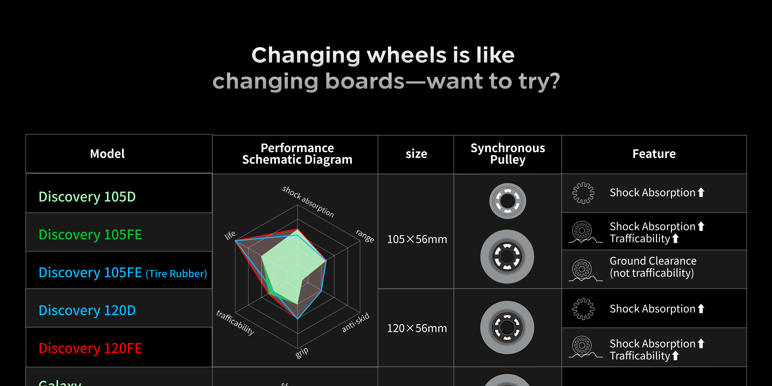The first gear drive system with a size of less than 50mm, made of high-strength chrome-molybdenum alloy material—Exway's innovation never stops!The ground clearance is increased, boosting passability by 56%; the minimum size of wheels that can be used is reduced from 100mm to 70mm.
