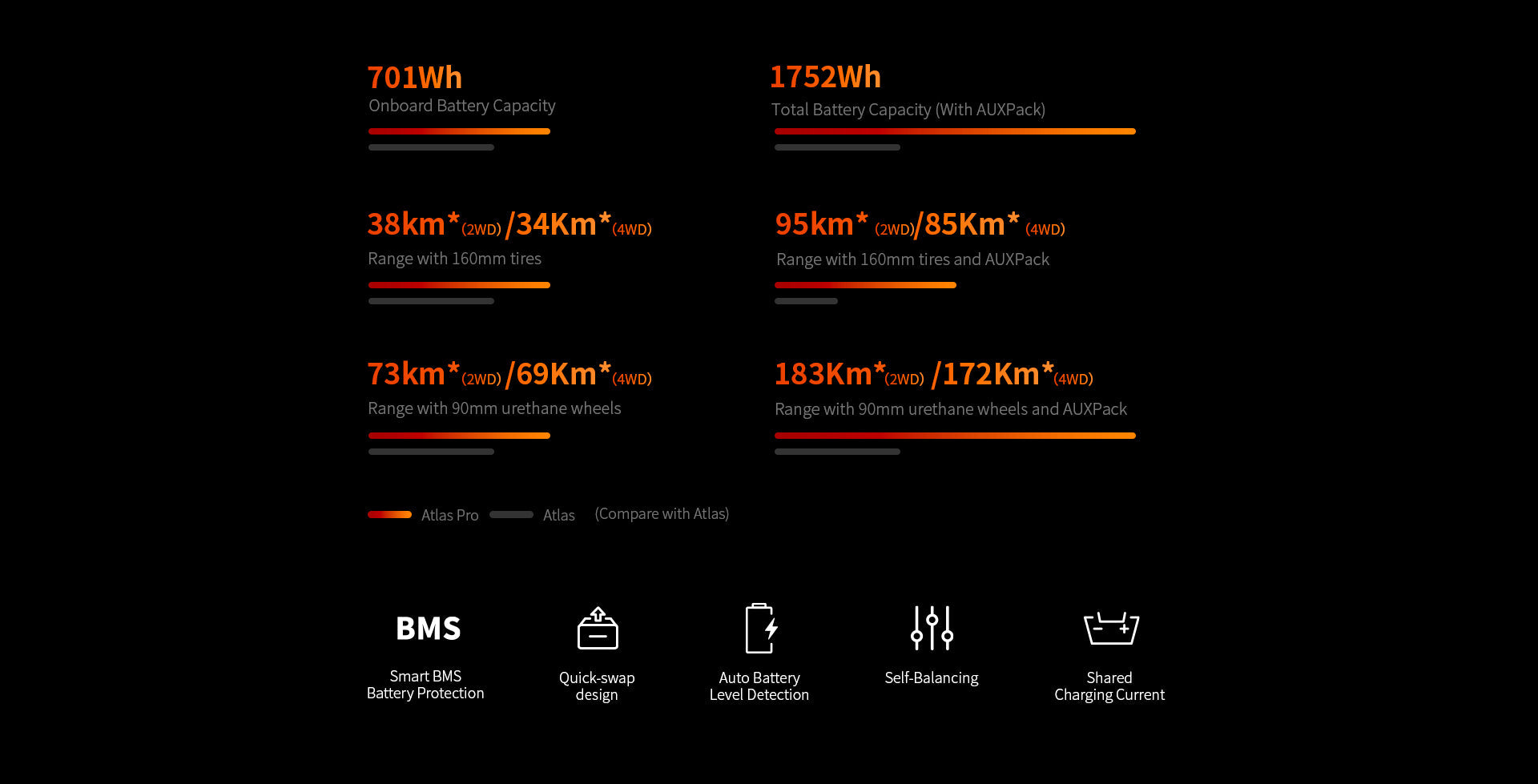 Both the Atlas Pro's onboard battery and AUXPack support 20A charging. With the AUXPack connected to the Atlas Pro, both the battery packs can be charged simultaneously by one charger with the smart BMS inside keeping the charging process safe and efficient. For the fastest charging times, disconnect the AUXPack and charge both the Atlas Pro and AUXPack separately using their own chargers.