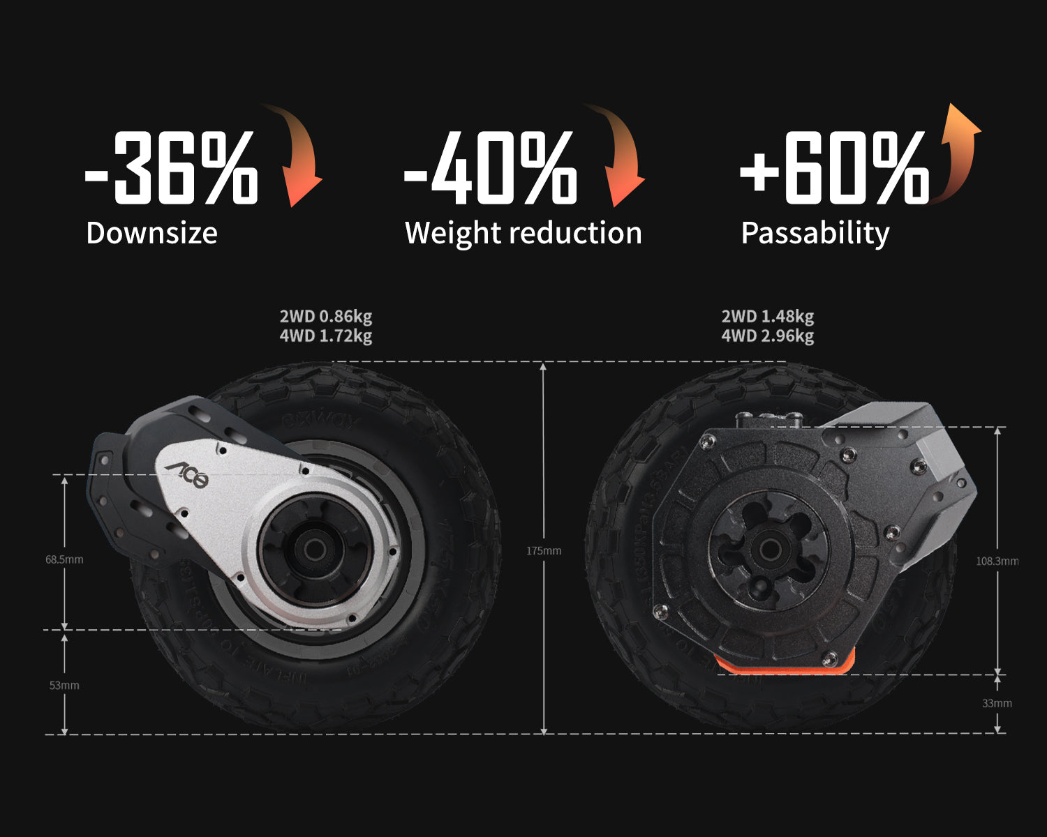 Compared to the ACE V1 gearbox, weight is reduced by 40%, with the total weight of the 4WD system reduced by 2kg.