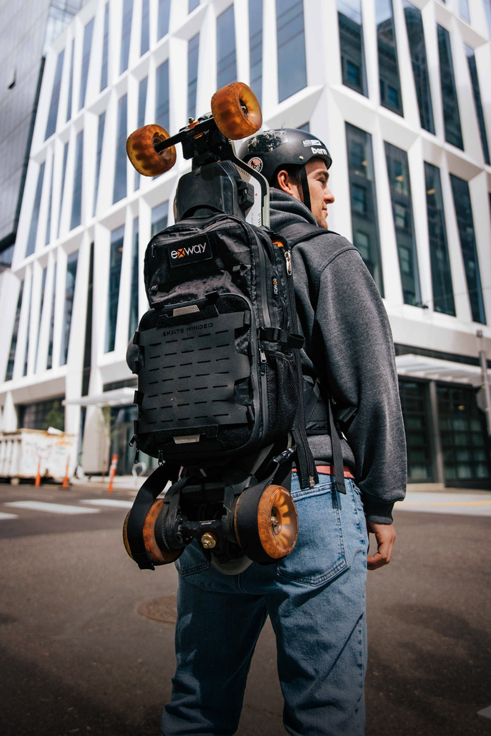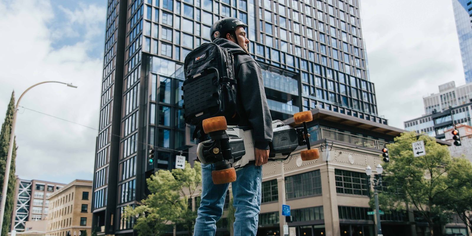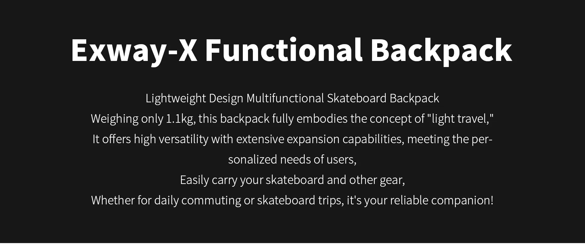 Detachable skateboard carrying system, 56% lighter compared to Exway's previous generation backpack (2.5kg reduced to 1.10~2.05kg)